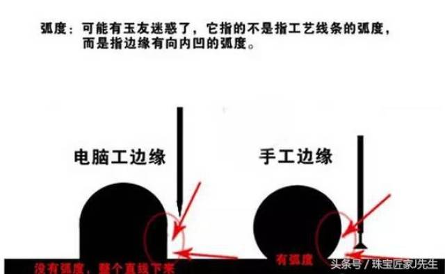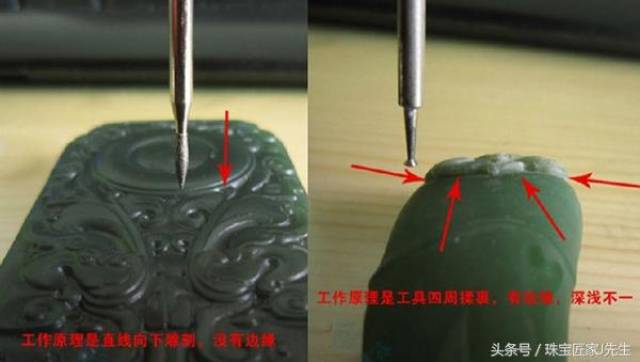 电脑雕刻工作原理是雕刻头垂直于雕刻表面,而手工雕刻中玉雕师会从不同角度下刀,因此电脑雕刻出来的雕件线条边缘是没有弧度的。