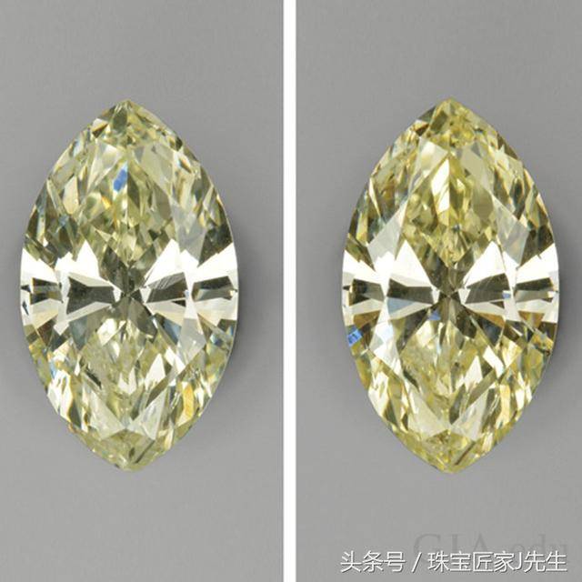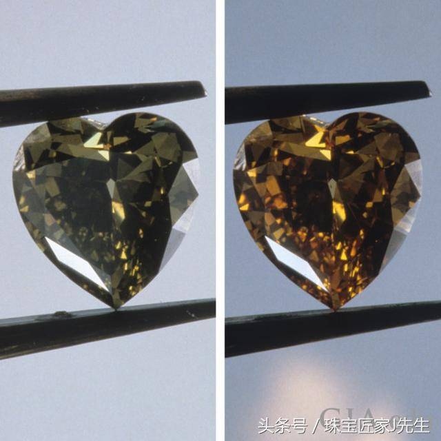这颗3.93克拉(ct)的变色龙钻石加热后呈现出从绿黄色(左)到褐黄色(右)的颜色变化。
