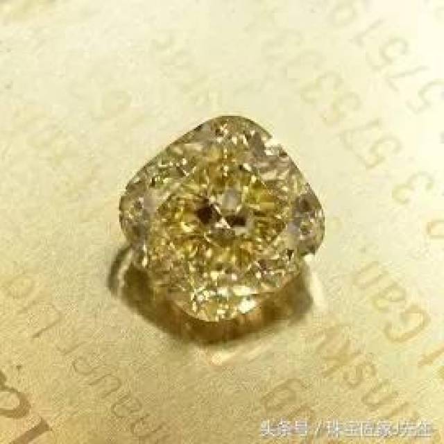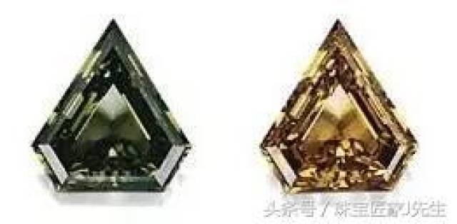 有名的变色龙钻石2001年5月的香港克里斯蒂珠宝拍卖会上,一个嵌有一颗暗彩绿带灰黄变色龙彩钻的钻戒以24万美元的价格成交。这颗变色龙钻石重4.41克拉,三角形,被嵌在白金戒指上。下图展示的是这颗钻石在加热前和加热后的颜色变化。↓↓↓