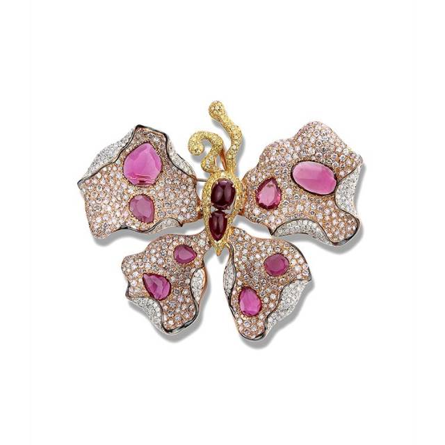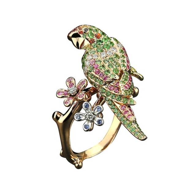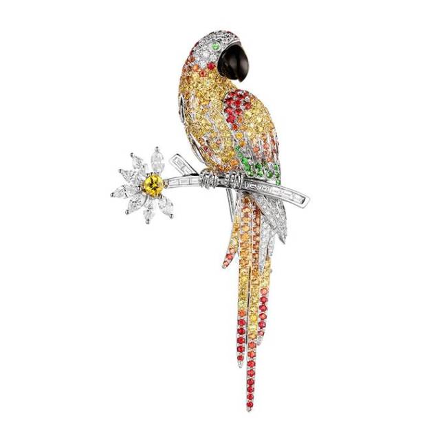 MONETA的能工巧匠们以金刚鹦鹉为灵感设计了一系列高级珠宝,用彩色钻石与宝石将金刚鹦鹉明艳绚丽的羽毛层叠展现,在光线中更显剔透玲珑。鹦鹉敛翼欲飞,顾盼生辉的神情亦是活灵活现,栩栩如生,生动独特的设计让人爱不释手。