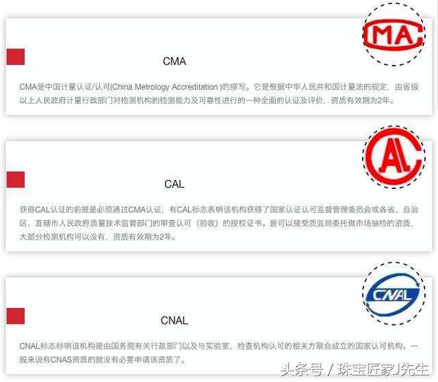 8、权威机构鉴定证书上有CMA、CAL、CNAS等法定认证标志及认证编号,其中,CMA是检测机构必备标志。很多检测、检验机构同时具备以上三个标志,具有三个标志的鉴定证书,就具备“三保险“。