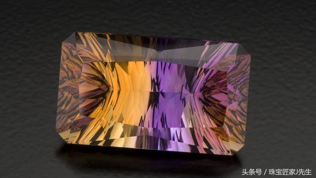 4.紫黄晶是少见的同时呈现紫、黄两种颜色的天然水晶,成因是紫水晶在高温的地壳运动中受热褪色成黄色,但高热忽然停止,就凝结在了半黄半紫的状态。