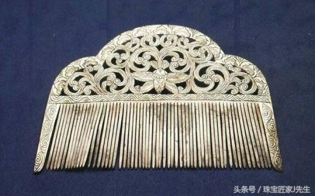 ↑↑↑鎏金透雕卷花蛾纹银梳