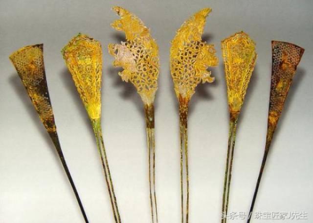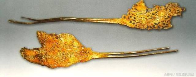 西安惠家村与广州皇帝岗中、晚唐墓所出者,有凤形、摩羯形、花鸟形、缠枝花卉形等多种花钗。运用模压、雕镂、剪凿等方法制成。唐代后妃、命妇所簪“花树”就是较大的花钗。它们往往是一式二件,花纹相同,方向相反,以多枚左右对称插戴。