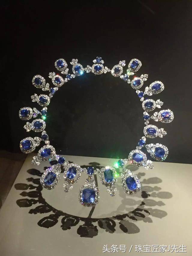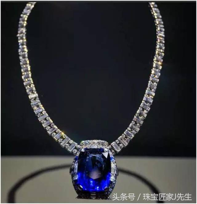卡地亚制作的俾斯麦蓝宝石钻石铂金项链,蓝宝石重98.57克拉,项链用了三百多颗钻石。