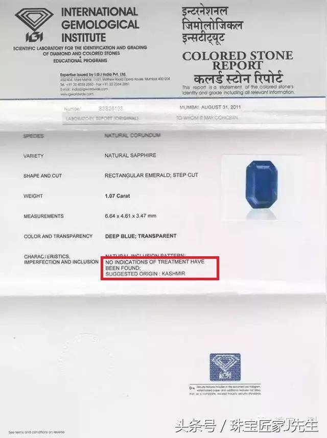 图中是IGI的一颗克什米尔蓝宝石证书,注意origin产地一项写的很明白:Kashmir。同时也注明了没有经过加热处理,你看懂了吗?