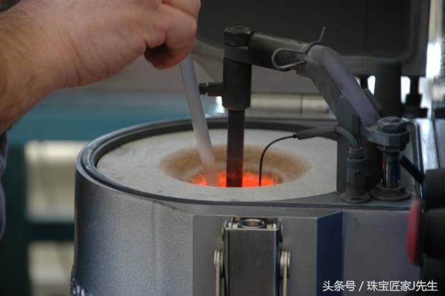待石膏模干后,将已经熔化配好的金水从水口注入。