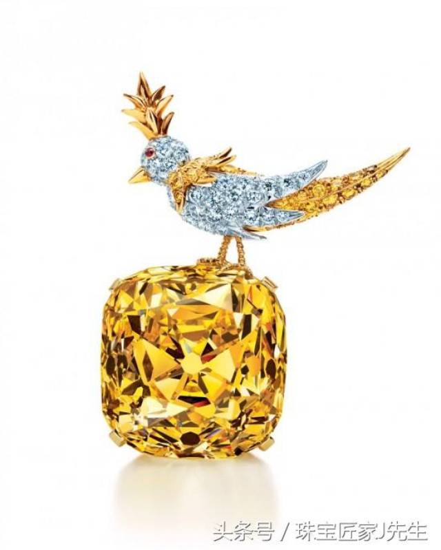 被誉为“珠宝诗人”,影响着品牌历史的珠宝设计师让·史隆伯杰于1965年发表了“石上鸟”胸针,当时的胸针主石是一颗重达128.54克拉的黄钻,这枚黄钻来自于《蒂芙尼早餐》中奥黛丽·赫本所佩戴的Tiffany珍珠黄钻项链,是当时最大且质地最好的天然黄钻之一,被称为“Tiffany 之钻”,这一造型也成为了Tiffany的镇店之宝。