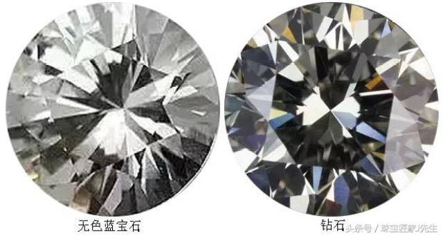 人造无色蓝宝石的折射率为1.77,远低于钻石的2.417,因此肉眼看上去,人造无色蓝宝石不具有钻石的璀璨火彩,可以轻易分辨。