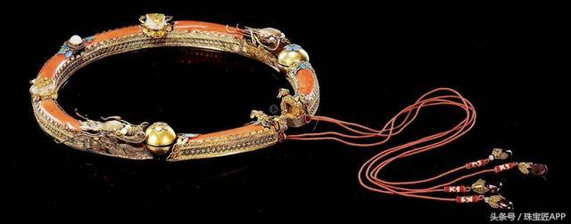其中,领约的形制为一个镂金的圆环形状,有开合式的活口,环上镶嵌宝石,活口处垂下两条绦。