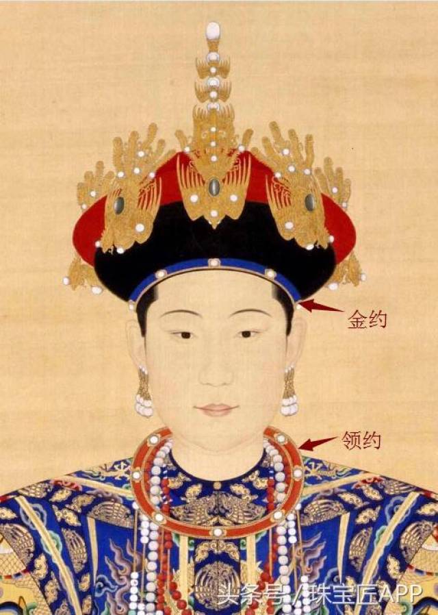 金约:皇后的金约上有镂金云13个,各饰东珠1颗,间以青金石,金约后方垂珠用金衔绿松石结,珠五行三就,每行大珍珠1颗,中间金衔青金石结2个,每结东珠珍珠各8颗,缀角用珊瑚;普通大臣之妻的金约上,只是中央有镂金火焰结子1块,饰珍珠1颗,左右镂金金龙凤各1条,金约后方的垂珠,就仅以青缎带代替。