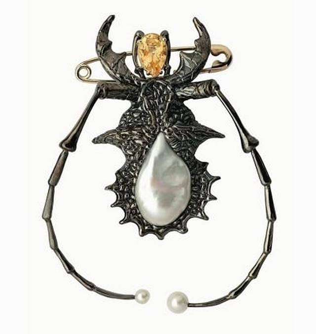 其中最为出彩的便是这两枚大尺寸胸针,因为这是一个真实的甲虫标本,被凝入树脂中,然后打磨镶嵌成为珠宝甲虫的腹部。