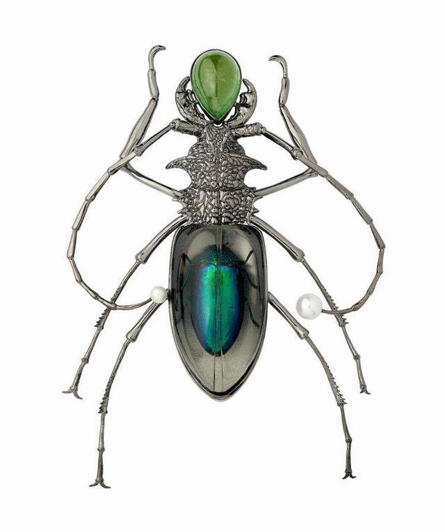 这些甲虫的身体都是银质,通过电镀的方式进行改色以模仿不同甲壳的颜色,仔细观察你会发现,甲虫的每一个身体细节都被如实还原,无论是颈甲的凸起颗粒,还是足节上尖利的倒刺。