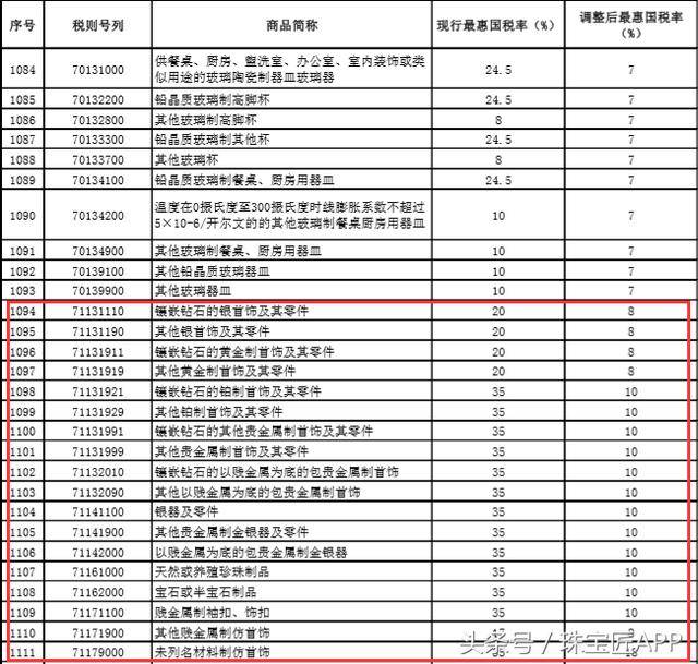 关税分对个人物品征收和对货物征收两种,2018年7月1日起,关税税率有了新的调整,黄金、银首饰制品由20%下调至8%,铂制、其他贵金属制品由35%下调至10%,天然或养殖珍珠制品、宝石或半宝石制品由35%下调至10%。
