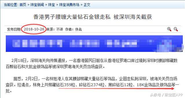 2018年2月,深圳海关截获一名男子,在腰间绑藏了359颗钻石、2374颗碎钻、12颗碎黑钻、以及18K金首饰、银制品。