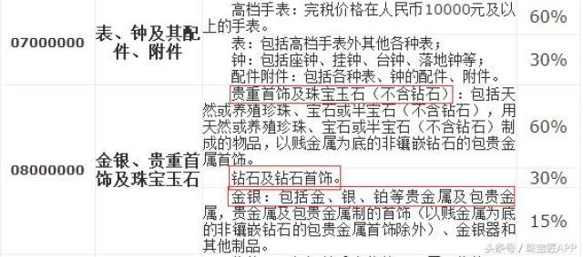 - 贵重首饰及珠宝玉石(不含钻石):包括天然或养殖珍珠、宝石或半宝石(不含钻石),用天然或养殖珍珠、宝石或半宝石(不含钻石)制成的物品,以贱金属为底的非镶嵌钻石的包贵金属首饰适用60%的税率。