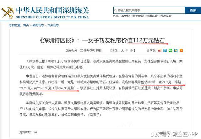 2018年8月,深圳海关查获一女子携带价值112万元人民币的钻石入关,其中整钻603颗,重29.07客,碎钻29.29克,总重达58.99克(294.95克拉)