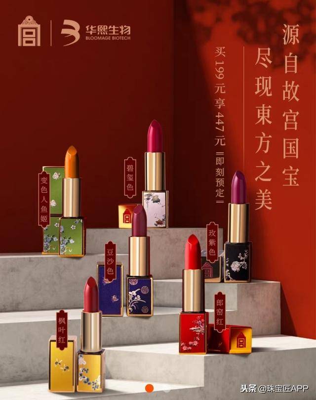 不过做口红毕竟不是做手办,得有资质,故宫找到的合作方是谁呢?就是华熙生物旗下品牌润百颜(做玻尿酸的)。顺藤摸瓜,在润百颜天猫店,我们找到了故宫口红。