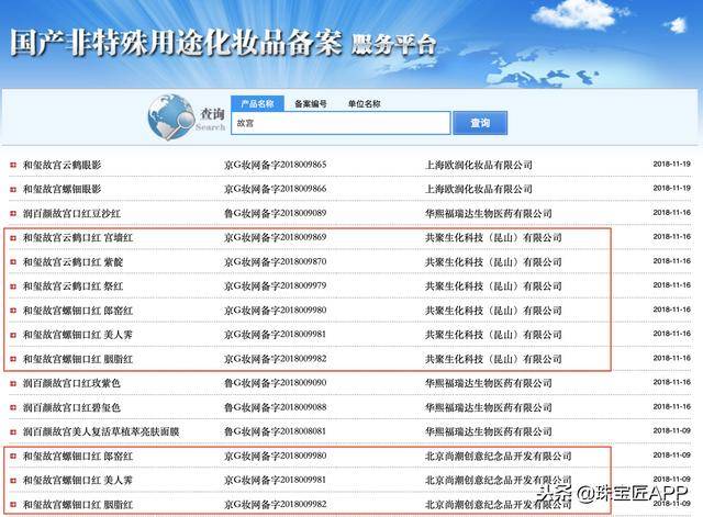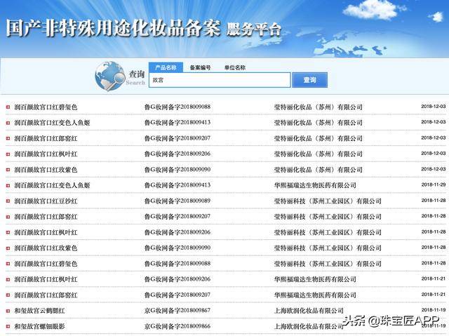 在国产非特殊用途化妆品备案平台上,搜“故宫”的时候我们还发现了这款和玺故宫口红,这就和第三家文创店有关了。