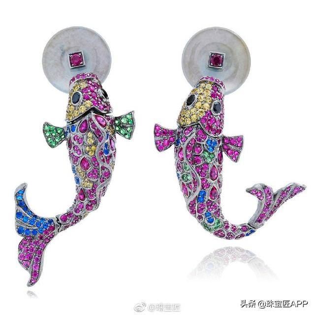 鲤鱼是中国传统的幸运元素之一,设计师借用鲤鱼的意象,在18K白金周边镶嵌各式的彩宝,鲤鱼的口中衔着一枚翡翠钱币,象征着年年有余。