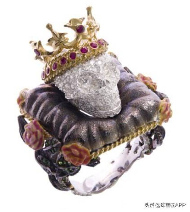 这枚骷髅戒指,采用18K金镶钻石、红宝石等彩宝镶嵌,头戴象征地位的高贵王冠,四周的玫瑰为阴郁的哥特风增添一抹浪漫气息,满载古雅气质的王者风范被镌刻成了永恒。