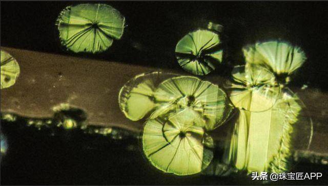 如果在显微镜下看的话,会看到橄榄石内部很有意思也是标志性的内含物---“睡莲状包体”,是内含晶体伴随有圆盘状的应力纹路,或者扁平的汽、液态两相内含物,外观近似睡莲叶的形状。