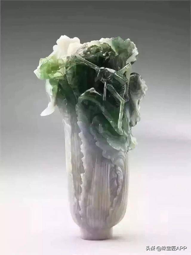 这件翠玉白菜与真实的白菜相似度极高,是由翡翠雕刻而成,设计师在菜叶上还精心雕刻了螽斯和蝗虫,寓意多子多孙。