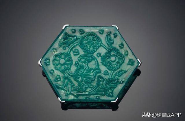 泰姬陵祖母绿,卡地亚。由重达141.13克拉的六角形雕刻祖母绿、圆形钻石、铂金和18K金镶嵌(法国标记)。2012年制作。卡地亚印记,编号:TI9645
