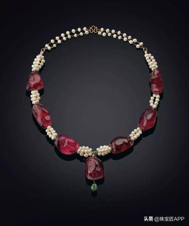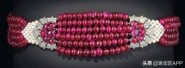 这款项链于1931年制造,采用292颗总重达356.56克拉的红宝石圆珠制成,点缀着132颗珍珠,两侧铂金镶嵌120颗钻石和红宝石,每个项链扣镶嵌六颗红宝石。