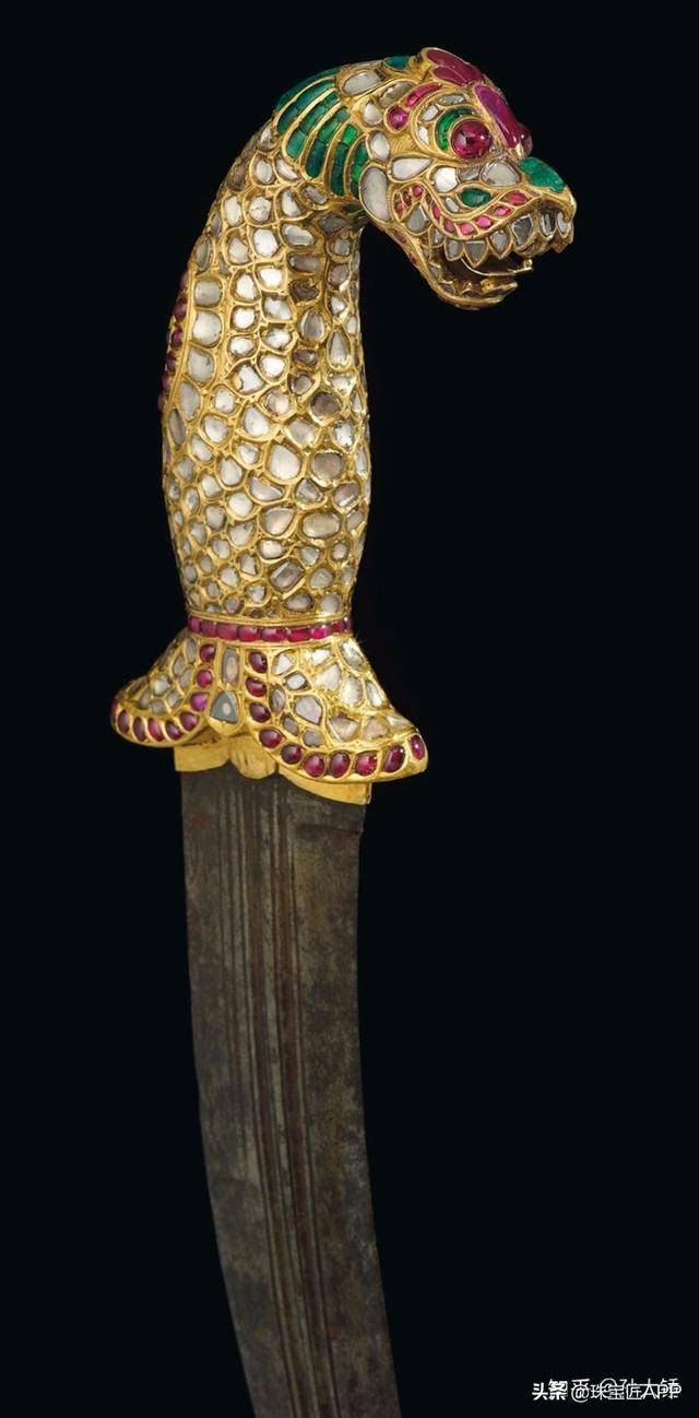 1790年至1810年坦加布尔(Tanjore)或迈索尔(Mysore)制作的匕首,这把匕首的金质手柄生动塑造了Yali(印度神话生物),一种狮首神兽,常见于印度南部的建筑设计中,采用了kundan工艺镶嵌盘形切割钻石、凸形红宝石和祖母绿。