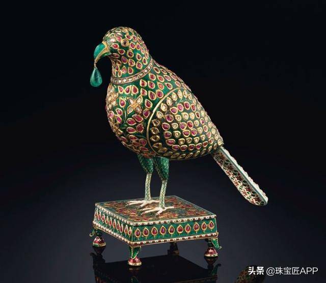 镶嵌宝石的珐琅鹦鹉,约1775年-1825年制作。镶嵌钻石、红宝石和祖母绿,并在其喙上饰以祖母绿吊坠,底座具有类似的珠宝珐琅装饰。