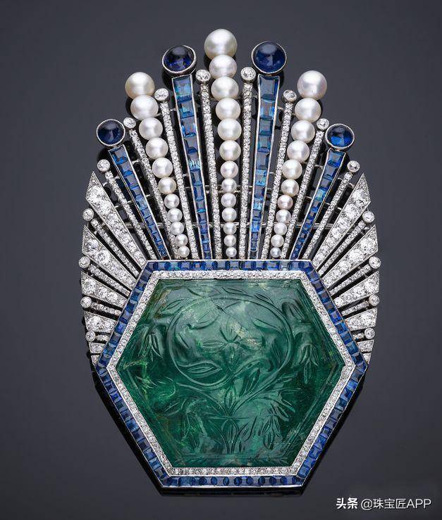 胸针顶部的钻石和蓝宝石鹭羽模仿印度传统鹭羽状头饰。这件作品为卡地亚日后镶嵌泰姬陵祖母绿提供了灵感。