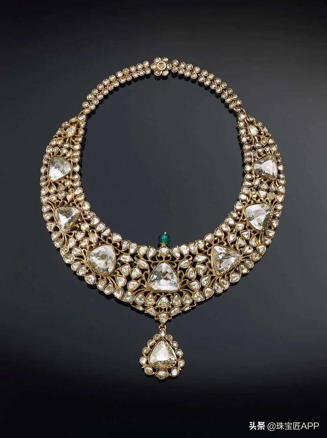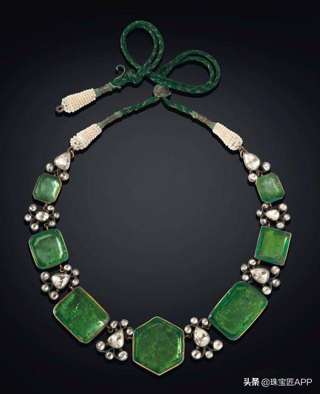 海德拉巴尼扎姆项链。钻石祖母绿珐琅项链。镶嵌三角形切割钻石、玫瑰形切割钻石、精雕祖母绿珠,配有绿色珐琅、黄金镶嵌,背面雕刻叶状图案,十九世纪后期制作