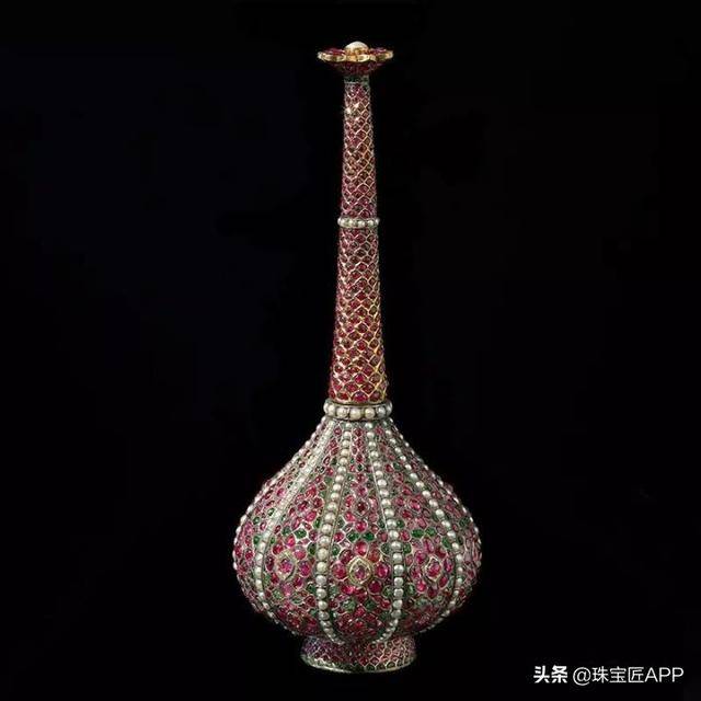 这只玫瑰水喷壶采用黄金镶嵌红宝石、祖母绿宝石和珍珠,1675-1725年制作。