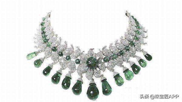 这条项链由13颗总重达154.7克拉的梨形哥伦比亚祖母绿组成,坠在莲花状铺镶钻石中间。