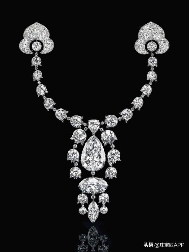 Devant-de-Corsage胸针,1912年,卡地亚。重达34.08克拉的梨形切割钻石、重达23.55克拉的椭圆形切割钻石、6.51克拉榄尖形切割钻石、3.54克拉心形切割钻石、铃兰形老式切割钻石链、铂金和18K金镶嵌(法国标记)。
