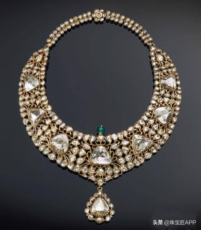海德拉巴尼扎姆项链(Nizam of Hyderabad Necklace ,十九世纪中后期制作)采用黄金镶嵌7颗三角形大钻石,采用kundan工艺将每颗钻石镂空镶嵌为叶子状。