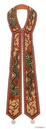 它是用锦缎制作而成,上面装饰着各种花纹样式,两端呈现三角形,在彩带的最底下悬挂着用金或玉石制作的坠子。