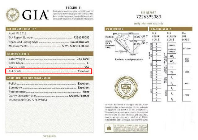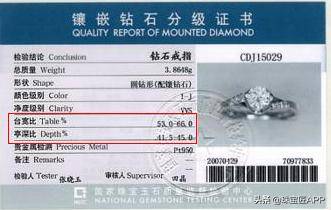 3、选择带有GIA证书或者NGTC证书的裸钻,看证书里面的proportion这一项,如果在GIA证书中标记为EX,或在NGTC证书中,写到台宽在53.0-66.0%,亭深在41.5-45.0%,意思是说切割比例的等级为完美,这样的裸石出现的领结也是很小的哦!
