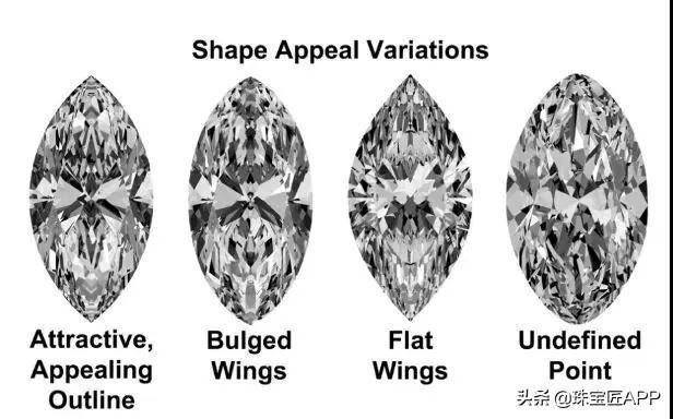 一般来说,马眼形钻石都会存在一定程度的“领结效应”,没有领结效应的钻石会看起来黯淡无光。这种现象在一些底部较浅或者非常深的钻石中非常常见。
