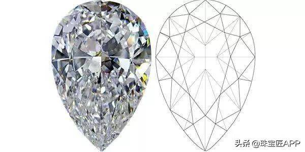 梨形钻石,又称水滴形钻石,上方呈尖形,下端呈圆形,结合了椭圆形切割和圆形钻切割的优点,是除圆形切割之外,最受人们喜爱的切割方式之一。