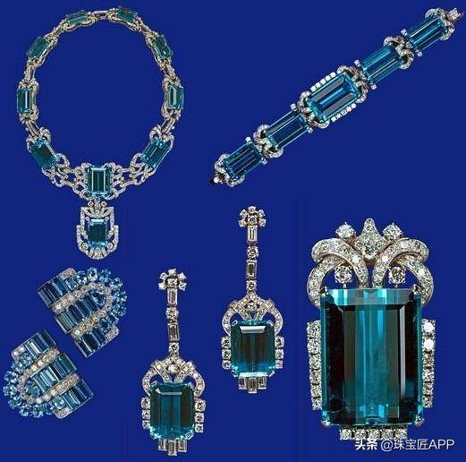 英国女王就曾经收藏的一套巴西海蓝宝石套装,一共有6件珠宝,前后经过了20年的改造与拼合,才形成了一套完整的套装。