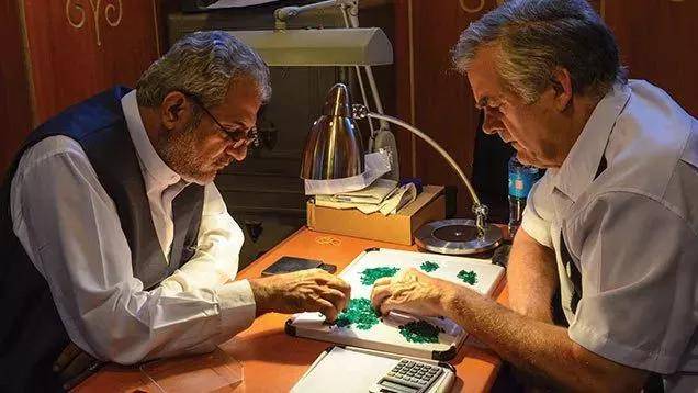 祖母绿宝石经销商在筛选不同品质的祖母绿
