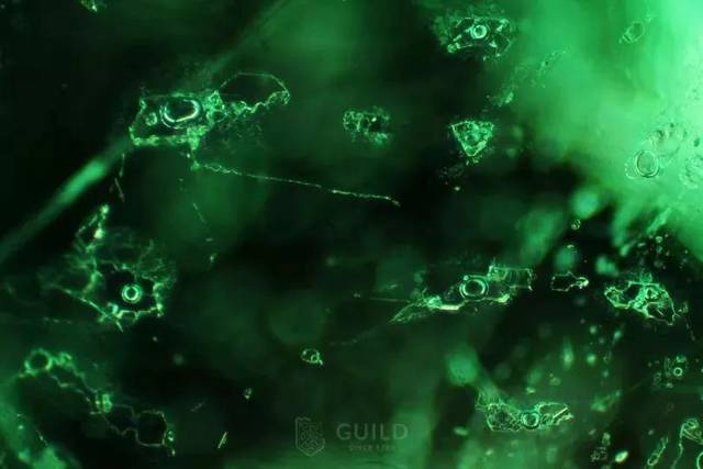 阿富汗祖母绿中的三相包裹体,外观不规则且通常包含一个气泡及多个晶体。