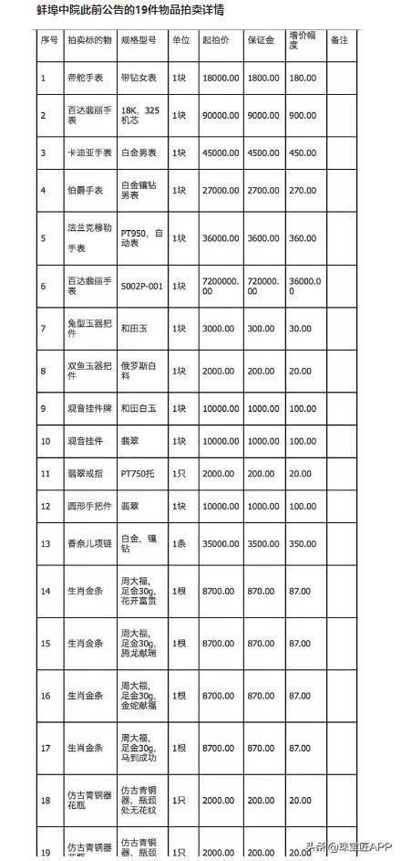 根据蚌埠市中级人民法院发布的公告显示,该拍卖标的包括各种奢饰品名表、金条、奢饰品首饰、玉器把件、玉器挂件、翡翠首饰、古玩杂项,共计19件。