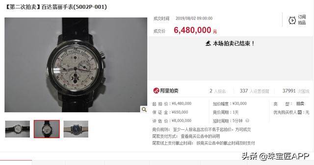 其中,被各大媒体争相报道的拍卖物品是一块百达翡丽手表,评估价高达800万元,初次起拍价720万,最终在第二次拍卖中以起拍价648万元被一位买家收入囊中。
