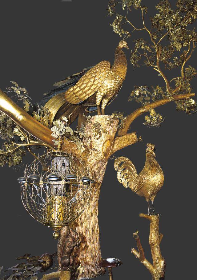 这座钟表,无论是装置上,还是设计构思上都是极为复杂的:一只孔雀站立在树上,在树的左侧是一种公鸡,右侧有一个笼子,笼子里是一只猫头鹰,树下有蘑菇和蜻蜓。
