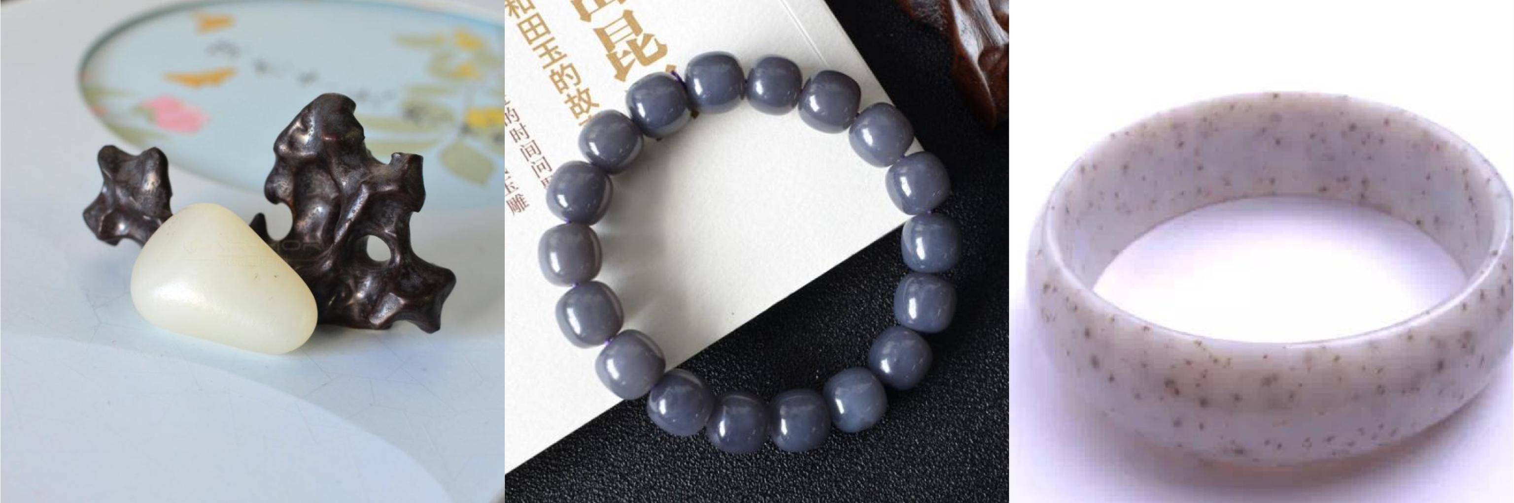 左:新疆羊脂白籽 中:烟紫手串 右:罗甸玉手镯