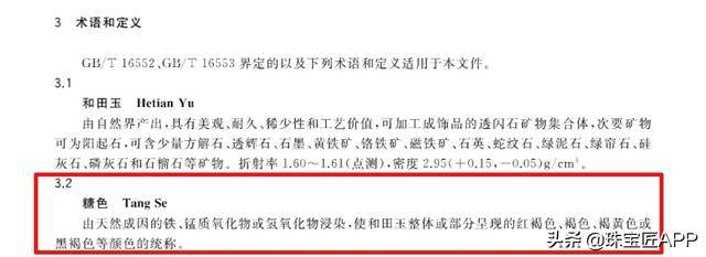 在新疆地方标准《和田玉》(DB65/T 035-2010)中“糖色”一词就曾在“3 术语”类目下独立出现,而此次的和田玉新国标GB/T38821-2020《和田玉 鉴定与分类》中“糖色”一词又在“3 术语和定意”类目下作为独立的小节出现,稳固了“糖色”一词在和田玉行业术语内的地位。