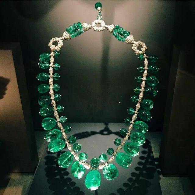 这条祖母绿项链,是由24颗哥伦比亚祖母绿组成,周围是一圈相对较小的祖母绿宝石,并用钻石将大小不一的祖母绿连接在一起,整款设计,工艺精致,样式华丽。